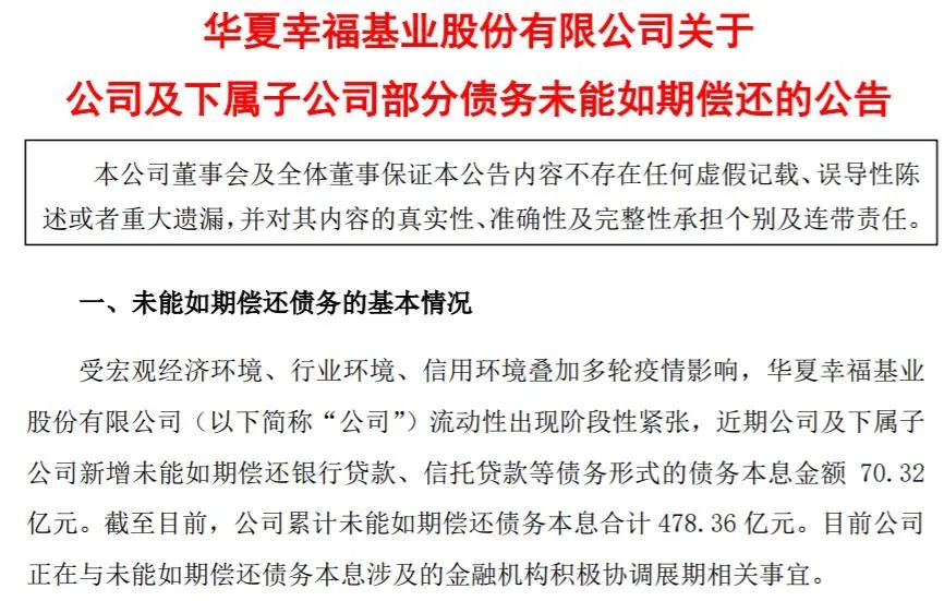 6月11日,華夏幸福基業股份有限公司公告,近期公司及下屬子公司新增未能如期償還銀行貸款、信托貸款等債務形式的債務本息金額67.87億,累計未能如期償還債務本息合計635.72億元。