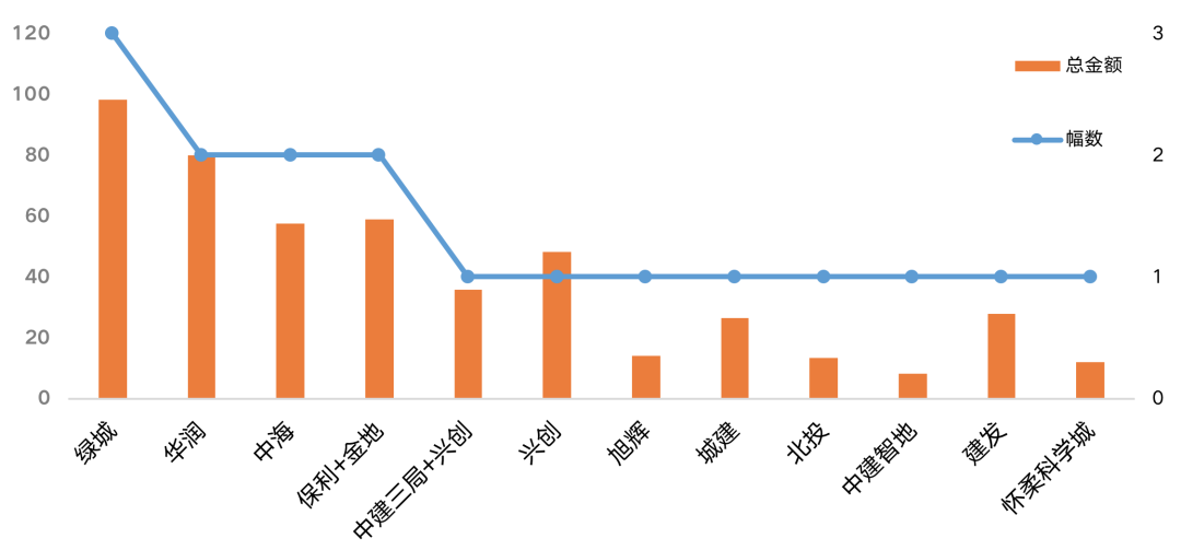 此外,規模房企旭輝、建發也有所斬獲,北京本土平臺公司(興創、北京城建、北投、懷柔科學城)拿地占比約為三成左右(按幅數計算)。