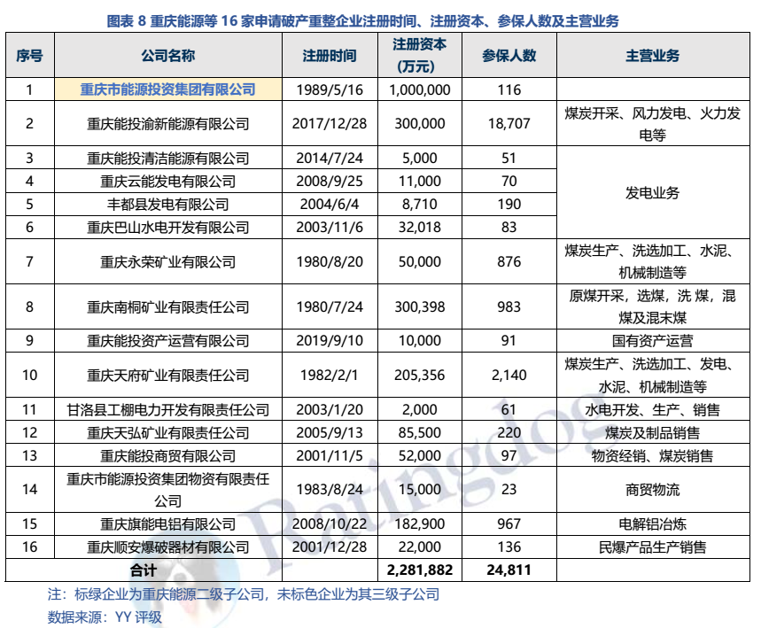 事件:2022年4月11日,據重慶破產法庭消息,重慶市能源投資集團有限公司(以下簡稱“重慶能源”)等16家企業以已具備破產原因但具有重整價值及可行性為由,分別向重慶市第五中級人民法院申請破產重整,并同時提出預重整申請。