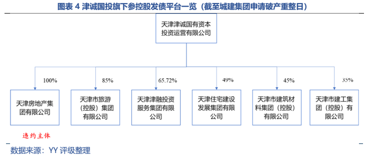 城建集團目前由天津津誠國有資本投資運營有限公司(簡稱“津誠國投”)100%持股。2017年,天津市政府為加快市屬企業混改,組建了津誠、津聯和津投等國有資產運營公司,并授權這些公司進行混改推介等工作。津誠國投參控股了天房集團、旅游集團、天津住宅等多家發債平臺,其中天房集團為違約主體。