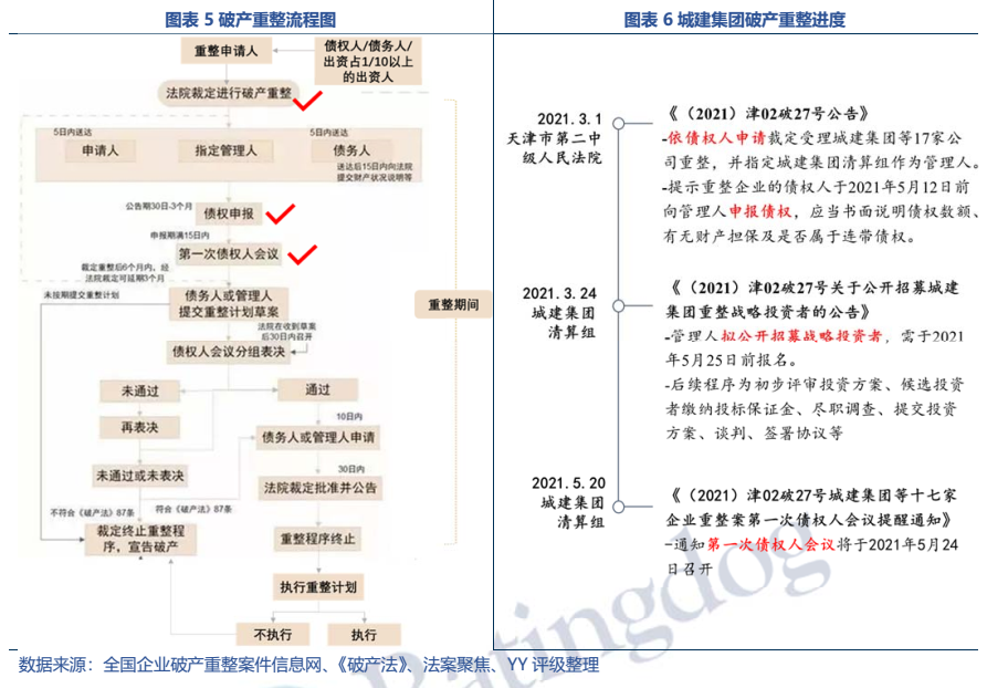 截至目前,距離法院裁定重整已過去13個月,暫未查詢到重整計劃草案,戰投招募情況也未有公開消息,推測進展緩慢。參照左邊流程圖,若未在裁定重整后的6-9個月內提交重整計劃草案,則城建集團將面臨終止重整程序、宣告破產的局面。城建集團官網對重整進度緘默其口,但從新聞動態來看,企業的各項工作似乎仍在正常開展,重整進展仍需關注。
