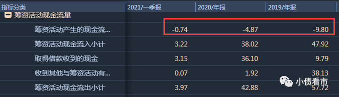 2020年和今年第一季度,春華水務籌資性現金流凈額分別為-4.87億和-0.74億元。