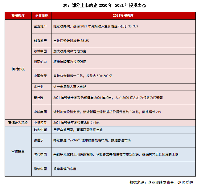 一季度末上市房企陸續(xù)公布了2020年成績(jī)單,業(yè)績(jī)會(huì)上部分房企透露了今年的銷售目標(biāo)和市場(chǎng)判斷,這無疑對(duì)未來企業(yè)投資策略產(chǎn)生巨大影響。整體而言,謹(jǐn)慎投資仍是主旋律,區(qū)域選擇仍聚焦長(zhǎng)三角和粵港澳大灣區(qū),且在22城集中供地之下,普遍認(rèn)為提升投資質(zhì)量、拓寬投資渠道是突圍的核心競(jìng)爭(zhēng)力。