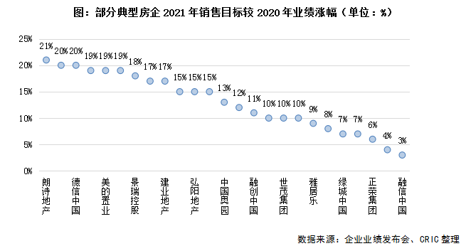 從近30家上市房企在業(yè)績(jī)發(fā)布會(huì)披露的2021年銷售目標(biāo)來看,整體目標(biāo)增幅有所放緩,近三成上市房企2021年的業(yè)績(jī)目標(biāo)預(yù)增低于10%,可以看出在杠桿紅利消失后,企業(yè)發(fā)展以穩(wěn)健、提質(zhì)增效為主。
