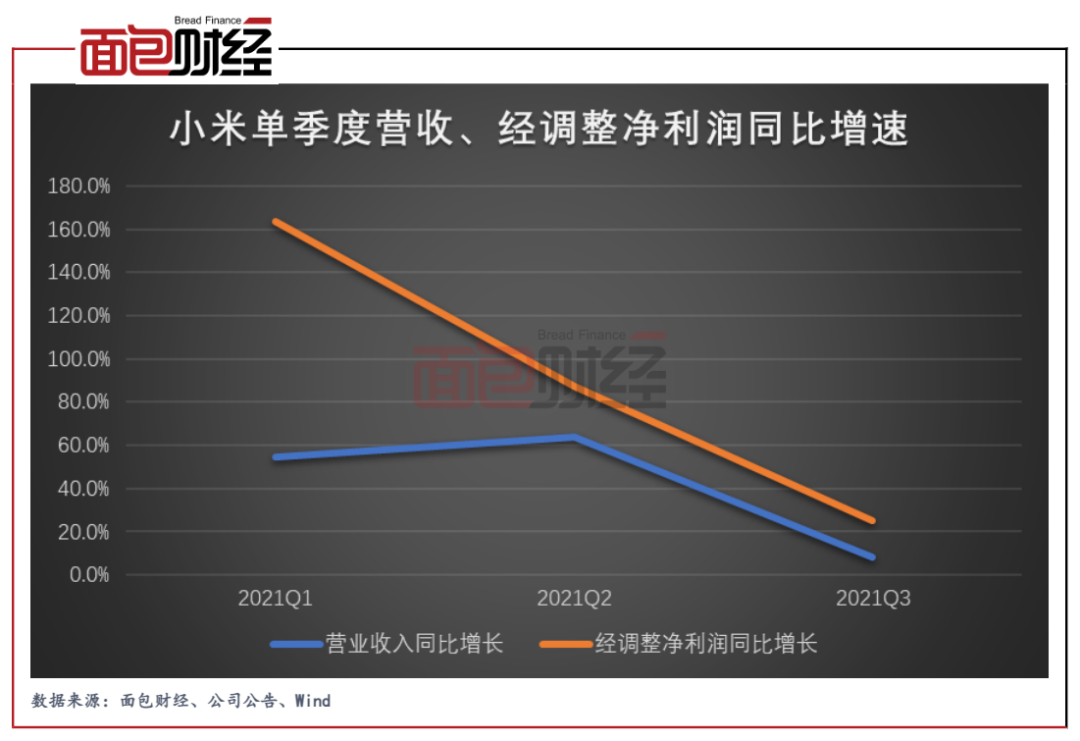 但是,第三季的表現讓市場失望。第三季度,小米營收同比僅增長8.2%,增速較上半年下跌51.3個百分點。單季經調整凈利潤同比增長25.4%,增速較上半年下跌93個百分點。