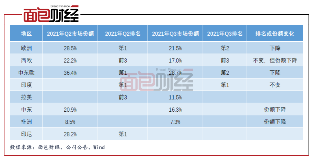 但到了2021年第三季度,小米的全球智能手機市占率下滑至第三名,市占率約為13.5%。公司在全球國家和地區市占率排名第一的數量減少至11個,而價值量相對更高的歐洲地區市場份額下滑至第2位。此外,公司在中東、非洲地區的市場份額也有所下降。
