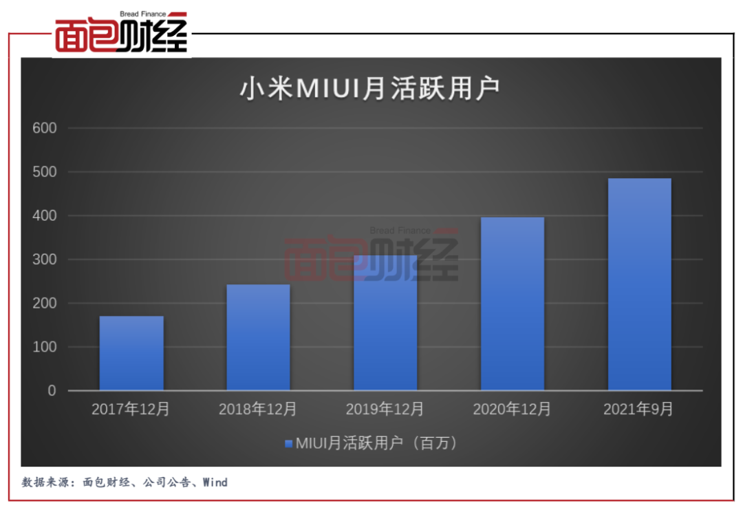 據公司招股書披露,截至2018年3月,公司基于安卓原生態系統的自有操作系統MIUI擁有大約190百萬月活躍用戶。到了2021年9月,小米的全球MIUI月活躍用戶數達到485.9百萬,同比增長32.0%。
