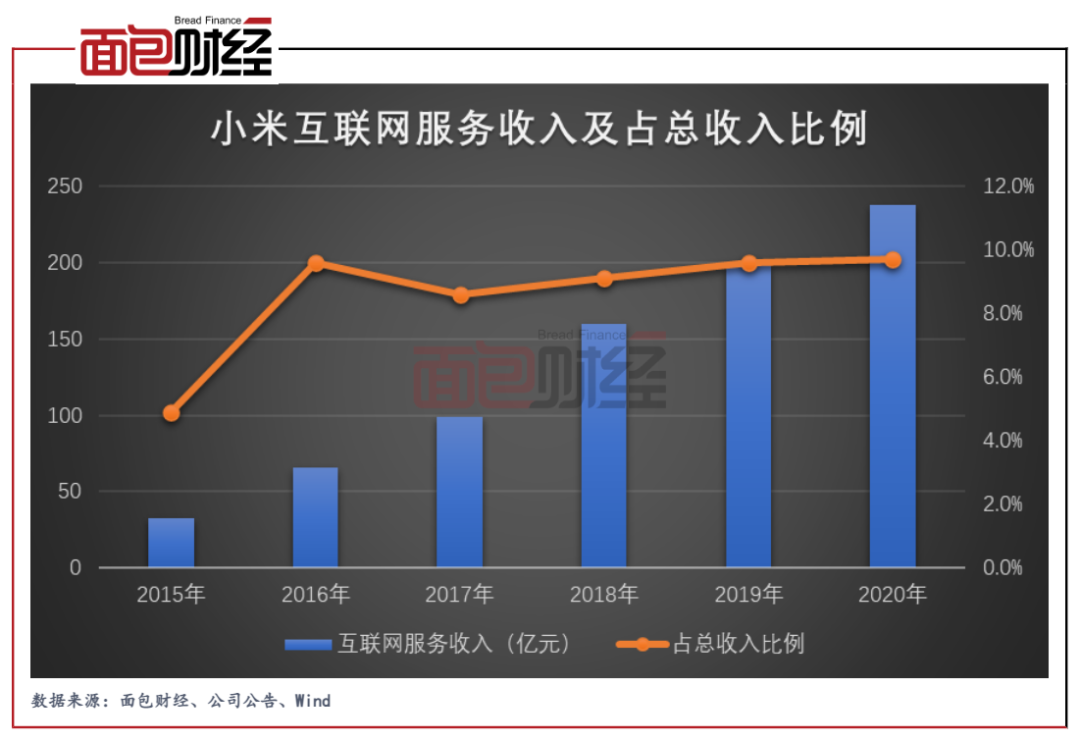 伴隨用戶數量增長,小米互聯網服務收入從2015年32.39億元上升至2020年237.55億元,同期的總收入占比從4.9%上升至9.7%。