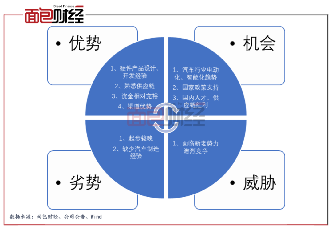 但另一方面,汽車的復雜度遠高于手機,公司目前并無直接的汽車制造相關經驗,未來需要跨越品質、產能、交付等多個門檻。此外,相比其他造車新勢力,公司入局時間較晚,在有限的時間內補足短板并實現超越的難度可想而知。