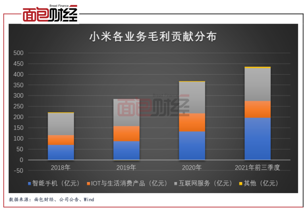 由于互聯網服務較高的毛利率,該業務持續貢獻小米主要的利潤來源。查閱小米2018年至2020年各業務的毛利貢獻分布,互聯網服務始終是公司的第一大毛利來源。