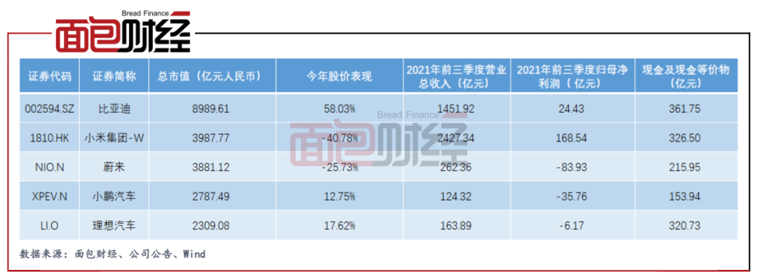 從市場表現來看,投資者顯然更相信困難的那一部分。在今年新能源汽車相關股票整體大幅上漲的背景下,小米官宣造車后并沒有給公司股價帶來多少支撐。對比新能源車企比亞迪、蔚來、小鵬汽車、理想汽車,小米今年前三季度的營收、歸母凈利潤均位居第一,但截至12月2日的市值卻明顯低于比亞迪,僅與蔚來較為接近。同時,通過股權、債券等方式融資,比亞迪以及造車新勢力企業賬上也積累了較為充裕的現金。