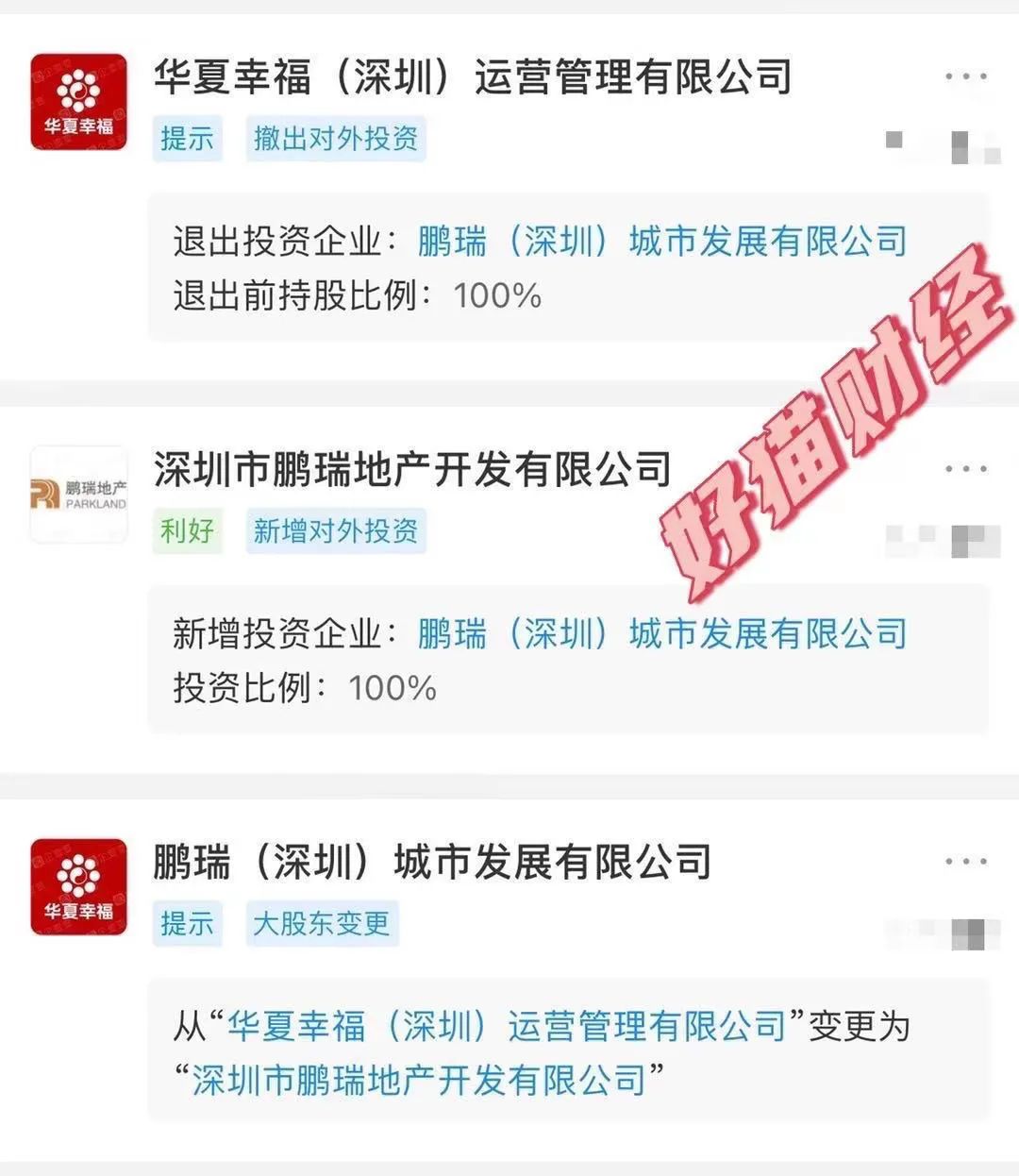 昨天,“華夏幸福(深圳)城市更新管理有限”的股東從“華夏幸福(深圳)運(yùn)營管理有限公司”變更為“深圳市鵬瑞地產(chǎn)開發(fā)有限公司”,并更名為“鵬瑞(深圳)城市發(fā)展有限公司”。