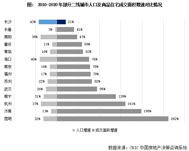 值得一提的是,與長(zhǎng)沙強(qiáng)人口吸附力形成鮮明對(duì)比的是長(zhǎng)沙樓市的不慍不火,具體來看,2010-2020年間長(zhǎng)沙市人口增量超過300萬人,十年累計(jì)增速高達(dá)43%,在全國各熱點(diǎn)一二線城市中也位列靠前,我們統(tǒng)計(jì)了部分二線城市十年來人口增速及商品住宅成交面積增速發(fā)現(xiàn),長(zhǎng)沙的人口高增長(zhǎng)與其樓市表現(xiàn)存在嚴(yán)重背離,全市成交規(guī)模表現(xiàn)平穩(wěn),十年間僅增長(zhǎng)了21%,較之部分省會(huì)城市如昆明、濟(jì)南、南寧等160%以上的增幅相差甚遠(yuǎn);與同處中部的重慶、武漢也有較大差距,樓市成長(zhǎng)性較為滯后。