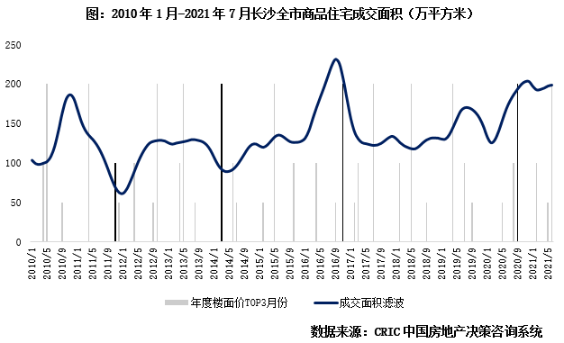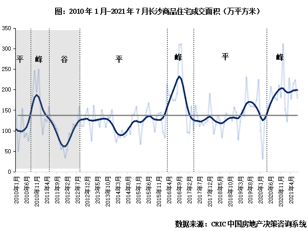 2016年后市場(chǎng)回歸理性,長(zhǎng)沙樓市在盤整波動(dòng)中小幅上行。2017-2018年成交恢復(fù)往年水平,市場(chǎng)進(jìn)入盤整期,2018年中“625新政”調(diào)控升級(jí),部分改善和炒房需求受到“重創(chuàng)”,市場(chǎng)開始緩步下行。直至2019年上半年才略有復(fù)蘇,下半年隨著二線城市成交熱度減退,購房者觀望情緒加重,市場(chǎng)略有降溫,2020年疫后高端住房需求被再次放大,疊加利好政策頻出“托市”,全年成交量再度踩上2000萬平方米。