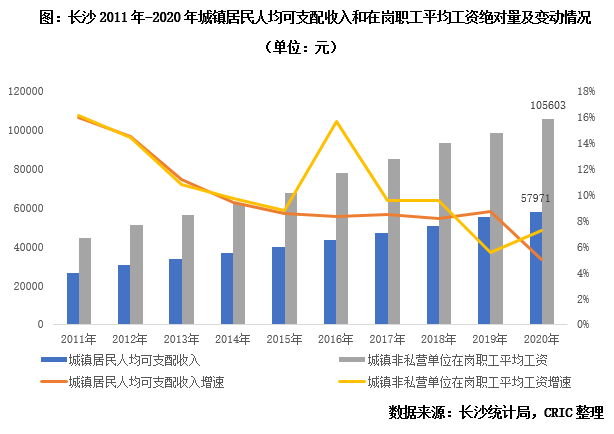 事實(shí)上,長(zhǎng)沙居民收入一直保持相對(duì)充沛的水平,我們列示了長(zhǎng)沙2011年以來城鎮(zhèn)居民人均可支配收入和在崗職工平均工資絕對(duì)量及變動(dòng)情況,可以看出,二者絕對(duì)量均保持正增長(zhǎng),截止2020年分別達(dá)到了5.8萬元和10.6萬元,增速呈波動(dòng)下行趨勢(shì),至2019年末維持在5%-7%。