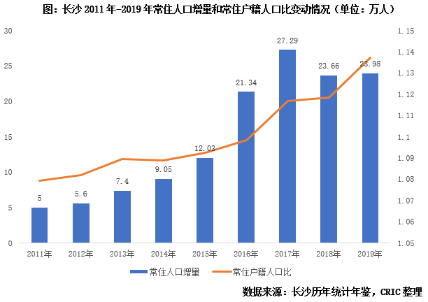 長(zhǎng)沙樓市在疫情后迎來“復(fù)蘇”,調(diào)控“松動(dòng)”,地價(jià)攀升是直接導(dǎo)火線,而背后更深層次的原因則是長(zhǎng)期積累購買力的集中爆發(fā)。縱觀長(zhǎng)沙2011年以來常住人口增量變化,2011-2014年雖然逐年攀升,但每年增量均不足10萬人,而步入2015年以來常住人口增長(zhǎng)明顯提速,每年增量均在25萬人左右,且常住戶籍人口比始終保持穩(wěn)中有增態(tài)勢(shì),至2019年末已達(dá)1.14,保持人口凈流入。