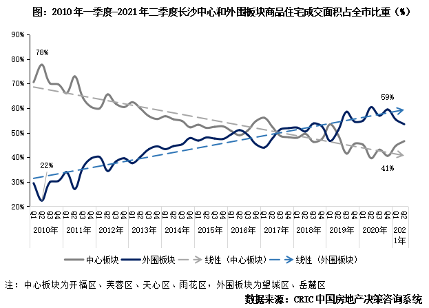 1、成交量:外圍“崛起”,2021年中岳麓、望城兩區(qū)占比升至全市6成