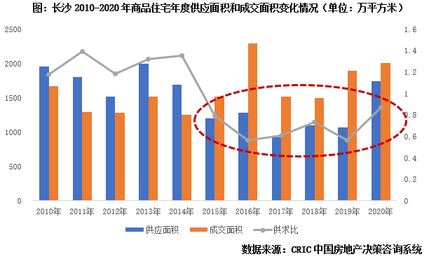 若要預(yù)判2021年全年總量,我們認(rèn)為還需結(jié)合商品住宅供應(yīng)等相關(guān)指標(biāo),一方面市場(chǎng)供應(yīng)和存量決定了成交的發(fā)揮空間,即成交的上限;另一方面,通過對(duì)比長(zhǎng)沙歷年來商品住宅的供求面積,我們不難發(fā)現(xiàn),市場(chǎng)以2015年為分界點(diǎn),隨著供應(yīng)整體縮量,市場(chǎng)逐步由供過于求向供不應(yīng)求轉(zhuǎn)變,且年供求比基本保持在0.6-0.9之間波動(dòng),值得關(guān)注的是,2002年供應(yīng)顯著放量的情況下,供求差值也有縮小的趨勢(shì),供求比維持在0.87,因而可以將商品住宅供應(yīng)量作為判斷短期(1年內(nèi))成交是否放量的重要依據(jù)。
