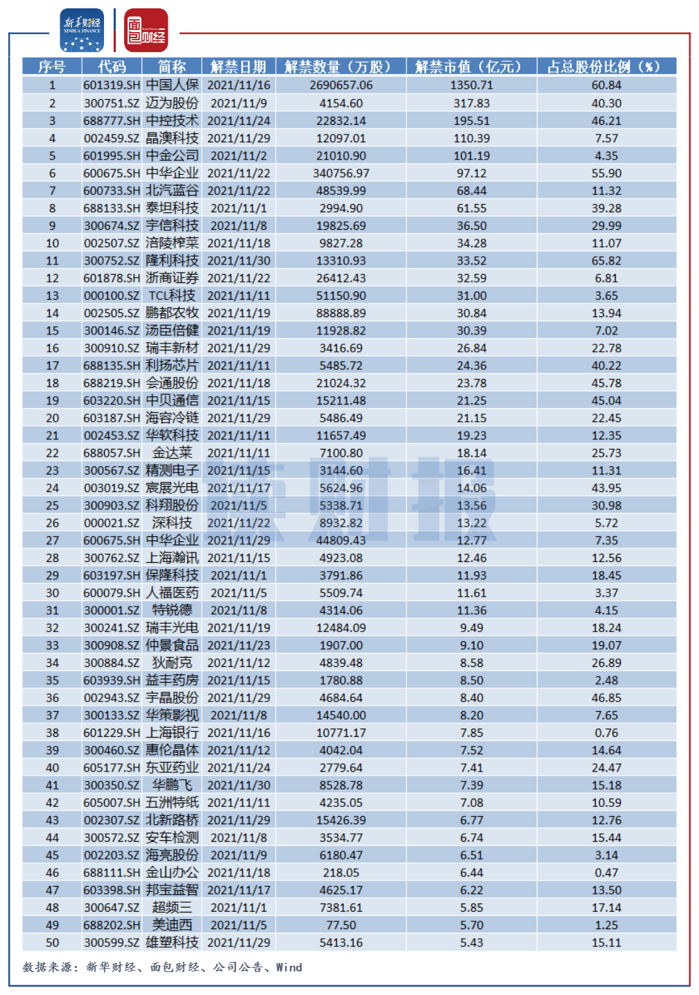圖2:2021年11月解禁市值排名前50個股