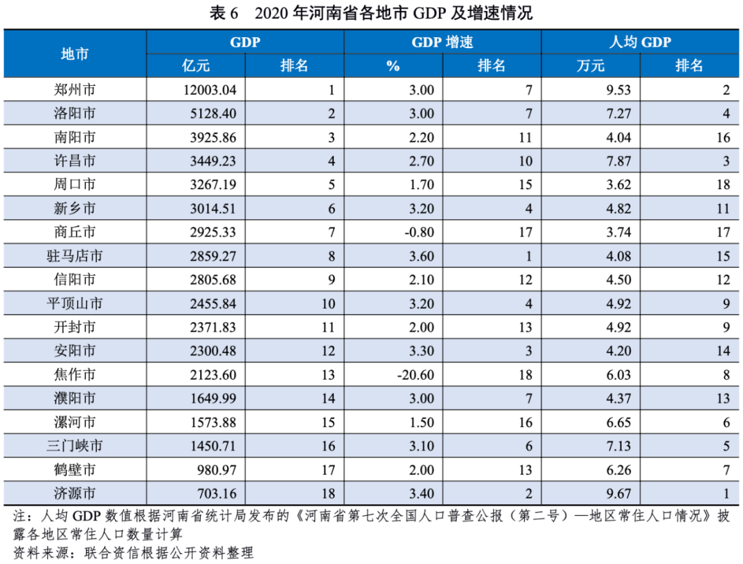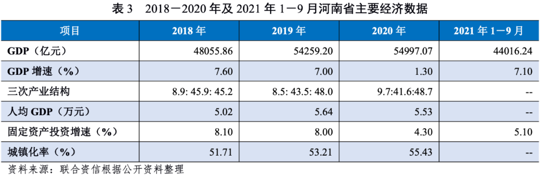 河南省位于我國中東部、黃河中下游,是全國重要的交通樞紐和物資集散地,人口資源豐富,經濟發展水平較好,2018-2020年河南省經濟總量居全國前列,人均GDP排名全國中下游。2018-2020年,河南省經濟增速及固定資產投資增速均有所放緩,但產業結構持續優化,經濟發展態勢良好。2021年以來,受洪澇災害和“新冠”肺炎疫情影響,前三季度主要經濟指標增速出現不同程度回落。