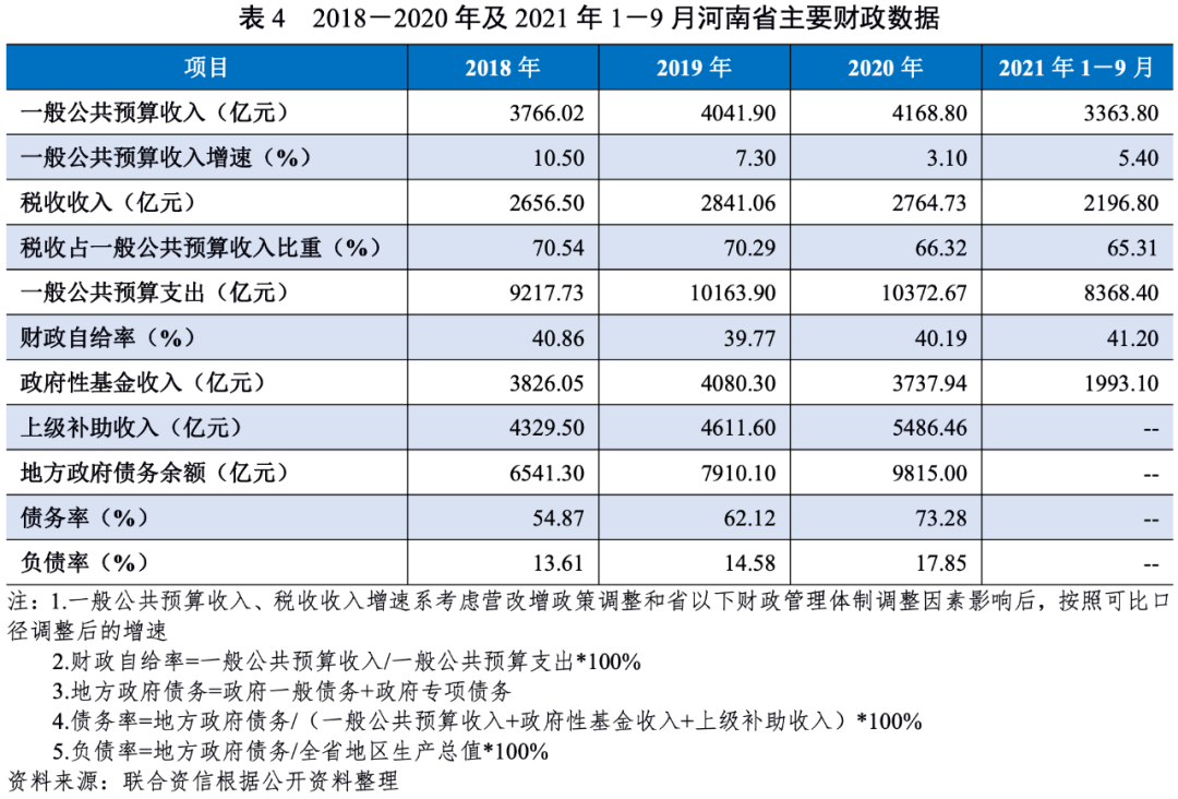 河南省位于我國中東部、黃河中下游,是全國重要的交通樞紐和物資集散地,經濟發展水平較好,近年來經濟總量居全國前列,人均GDP排名全國中下游。2018-2020年,河南省經濟增速及固定資產投資增速均有所放緩,但產業結構持續優化,經濟發展態勢良好。2021年以來,受洪澇災害和“新冠”肺炎疫情影響,前三季度主要經濟指標增速出現不同程度回落。2020年,河南省一般公共預算收入全國排名第八位,一般公共預算收入穩定性較強但財政自給能力一般,政府性基金收入和上級補助收入是河南省綜合財力的重要支撐。2020年,河南省政府負債率和債務率在全國各省(自治區、直轄市)中分別排名第5位和第6位,政府負債水平相對較低,債務負擔尚可。