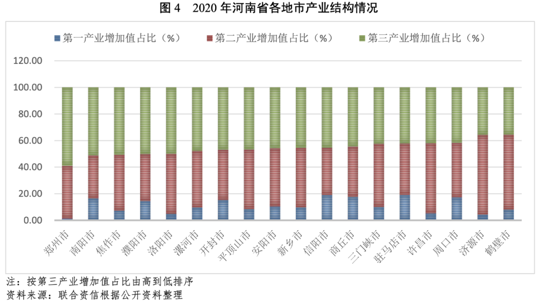 從產業結構來看,鄭州市、南陽市、焦作市、濮陽市和洛陽市第三產業對經濟拉動作用較大,第三產業增加值占比均超過50.00%,其中鄭州市第三產業增加值占比為59.00%,居全省首位;漯河市、開封市、平頂山市等11個地市第三產業增加值占比介于40.00%~50.00%之間,其中,駐馬店市、信陽市、商丘市、周口市和開封市第一產業增加值占比相對較高,均在15.00%以上;濟源市和鶴壁市第三產業增加值占比較低,分別為35.80%和35.60%,上述2個地市第二產業較為發達,第二產業增加值占比分別為60.00%和56.40%,位列全省第一和第二。