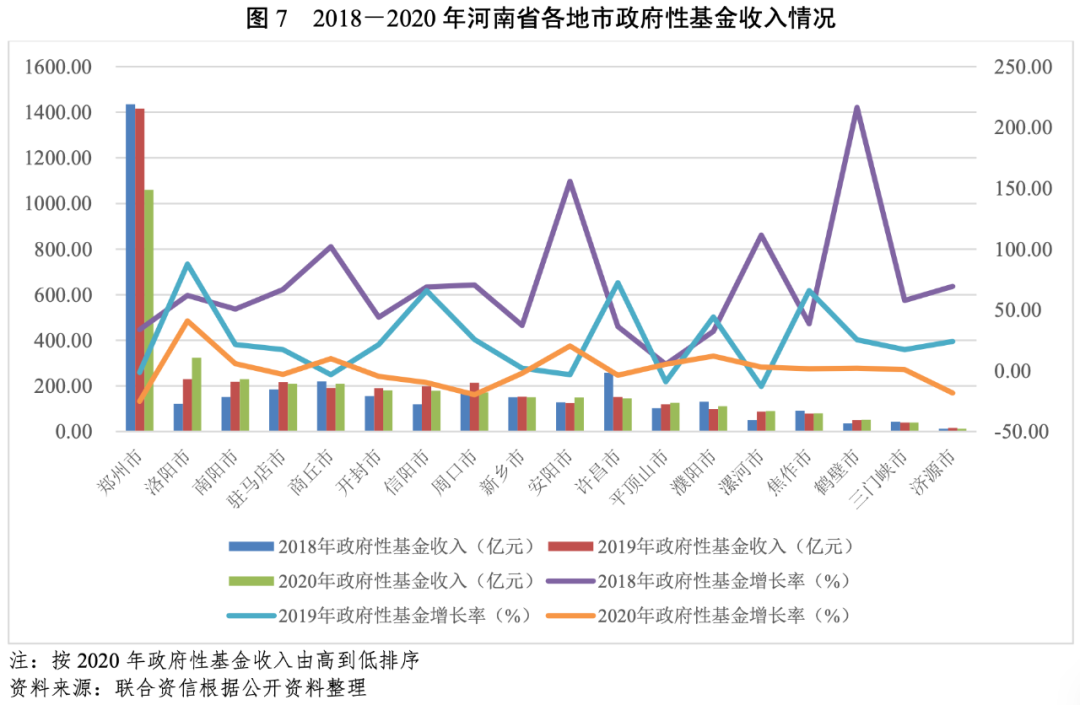 政府性基金收入方面,鄭州市政府性基金收入規模最高,2018-2020年政府性基金收入均超1000億元,占全省政府性基金收入的比例分別為37.50%、34.69%和28.34%。2020年,除鄭州市以外,其他地市政府性基金收入較大的有洛陽市、南陽市、駐馬店市和商丘市,規模均超過200億元;較小的為濟源市和三門峽市,規模均在50億元以下。從政府性基金收入增速來看,2020年,洛陽市、安陽市和濮陽市政府性基金收入同比增長較快,其中洛陽市增速最高,達40.91%;有14個地市政府性基金收入增速較2019年有所下降,其中8個地市政府性基金收入較2019年有所下降,其中,鄭州市、周口市和濟源市2020年政府性基金收入同比分別下降25.15%、19.65%和18.30%,降幅較大。
