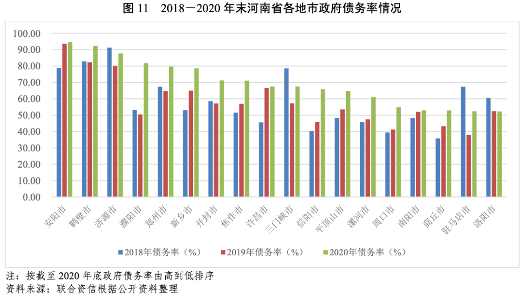從發債城投企業全部債務與“發債城投企業全部債務+地方政府債務”的比值看,截至2020年底,9個地市比值超過50%,其中,鄭州市和三門峽市比值分別為70.19%和69.45%,整體處于較高水平。