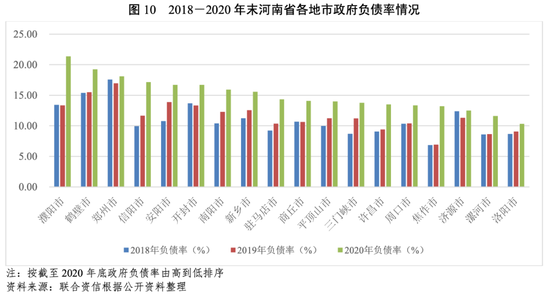債務負擔方面,截至2020年底,河南省各地市政府負債率均較上年底有所提高,其中濮陽市負債率增幅最大,較上年底上升8.02個百分點。截至2020年底,濮陽市政府負債率最高,為21.37%,洛陽市政府負債率最低,為10.32%,其余地市政府負債率在11.00%~20.00%之間不等。整體看,河南省各地市政府債務負擔處于尚可或較輕水平。
