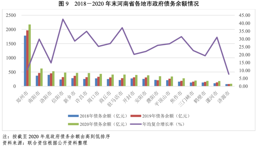 從地市層面看,河南省下轄各地市經濟發展和財力水平分化較為明顯,整體呈“中心強、四周弱”的發展格局,鄭州市作為省會城市和全省經濟中心,GDP規模較大且保持穩定增長,其他地市經濟發展水平與之差距較大。河南省各地市一般公共預算收入穩定性較強,除鄭州市、濟源市和洛陽市以外,其他各地市財政自給能力較弱。2018-2020年末,河南省各地市政府債務余額均呈上升趨勢,其中,信陽市、駐馬店市、許昌市和焦作市等地市債務余額增速較快。截至2020年底,河南省各地市政府負債率較上年底均有所增長,河南省各地市政府債務負擔處于尚可和較輕水平,但政府債務率差異較大。