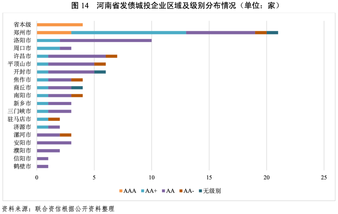 河南省下轄18個地市(含省直管市濟源市)均有發債城投企業,城投企業行政級別以區縣級和地市級為主,發債城投企業主要分布在省會鄭州以及洛陽、許昌、開封和平頂山等省會周邊地市,其中,鄭州市發債城投企業數量最多、信用等級較高。河南省發債城投企業主體級別以AA級為主,高級別城投集中在省本級及鄭州市。