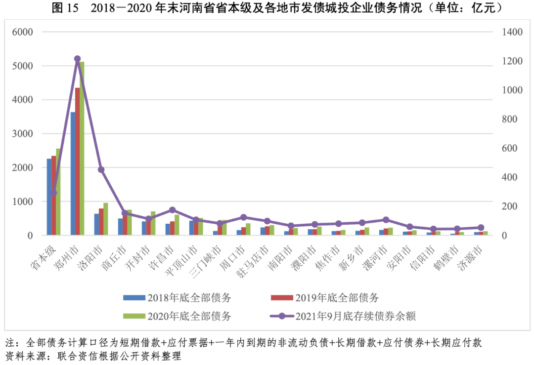 從企業層面看,河南省及下轄18個地市(含省直管市濟源市)均有發債城投企業,發債城投企業主要分布于省會鄭州以及洛陽、許昌、開封和平頂山等省會周邊地市,發債城投企業主體信用級別以AA級為主,高級別城投企業集中在省本級及鄭州市。2020年,河南省發債城投企業債務負擔有所加重,其中漯河市、信陽市和濟源市等地市短期流動性壓力較大,各地市發債城投企業債務償還對外部籌資依賴仍然較大。截至2021年9月底,鄭州市、洛陽市和省本級發債城投企業未來三年到期債券規模大,其中鄭州市發債城投企業一年內集中兌付壓力較大。河南省省本級及各地市“發債城投企業全部債務+地方政府債務”規模差異較大,省本級和鄭州市規模遠超其他地市,地方綜合財力對“發債城投企業全部債務+地方政府債務”保障能力偏弱的區域主要為三門峽市、濟源市、許昌市和開封市,需關注面臨集中償付壓力和債務負擔較重的區域內城投企業的信用風險。