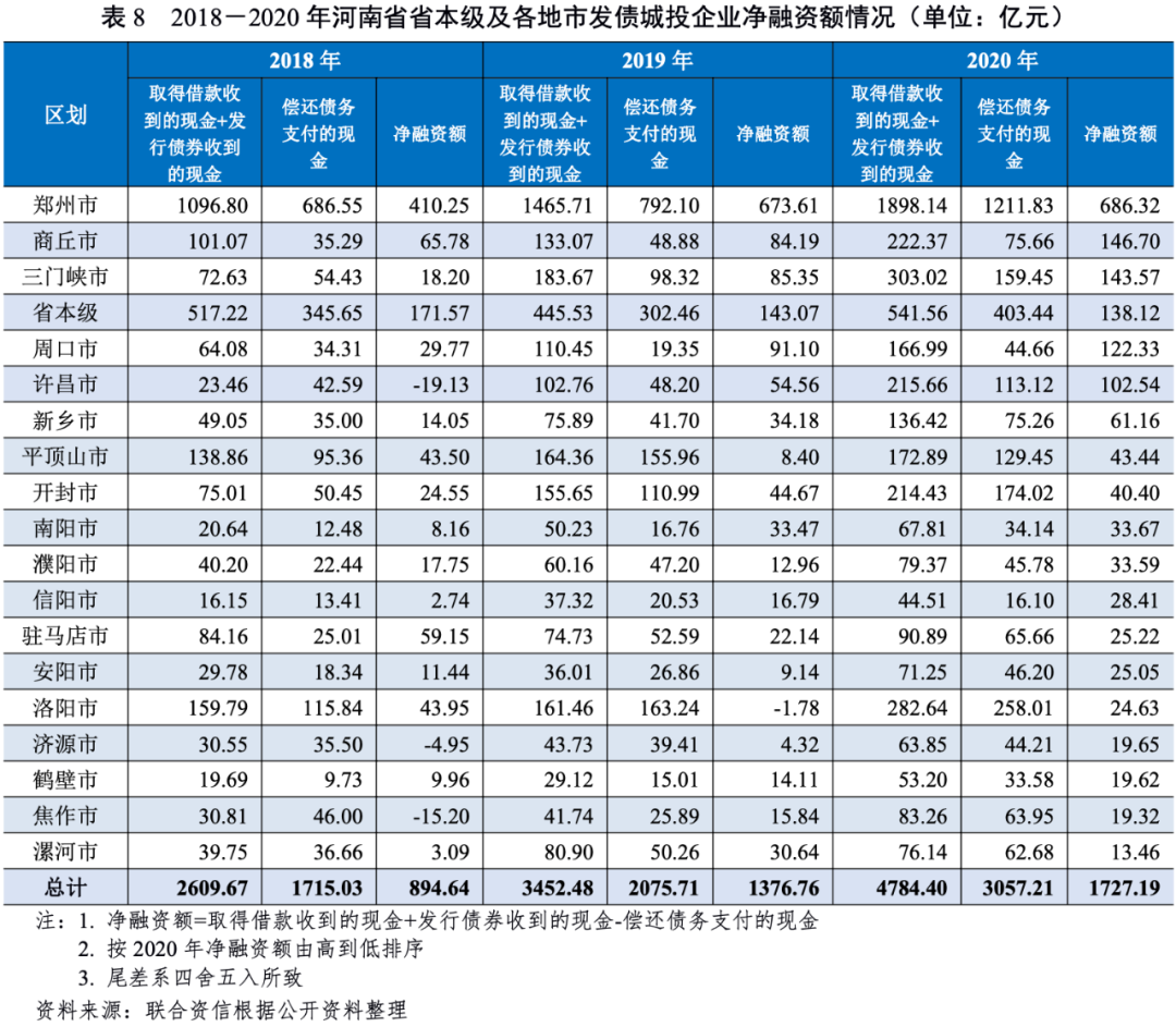 從河南省發債城投企業對外融資情況來看,考慮到政府注資、往來拆借等行為可能對城投企業融資活動現金流入及流出產生擾動影響,本報告利用“取得借款收到的現金+發行債券收到的現金”來表示城投企業從金融機構及債券市場進行融資形成的現金流入,利用“償還債務支付的現金”來表示城投企業償還剛性債務形成的現金流出,更為直觀地體現了城投企業自身融資能力以及金融機構及債券市場對城投企業的認可度。2018-2020年,河南省發債城投企業“取得借款收到的現金+發行債券收到的現金”呈現快速增長態勢,年均復合增長35.40%。具體來看,鄭州市發債城投企業“取得借款收到的現金+發行債券收到的現金”規模遠大于省本級及其他地市,2020年達1898.14億元,占全省總計的39.67%;省本級發債城投企業“取得借款收到的現金+發行債券收到的現金”規模排名第二,2018-2020年呈波動增長趨勢;除駐馬店市發債城投企業“取得借款收到的現金+發行債券收到的現金”規模呈波動增長趨勢以外,其他地市發債城投企業“取得借款收到的現金+發行債券收到的現金”規模均持續增長,其中,許昌市、焦作市、安陽市和鶴壁市發債城投企業“取得借款收到的現金+發行債券收到的現金”規模2020年增幅顯著,同比分別增長109.86%、99.50%、97.88%和82.68%;僅漯河市發債城投企業“取得借款收到的現金+發行債券收到的現金”規模2020年同比有所下降。2018-2020年,河南省發債城投企業“償還債務支付的現金”規模持續增長,年均復合增長率為33.51%,略低于“取得借款收到的現金+發行債券收到的現金”年均復合增長率。具體來看,省本級、周口市、平頂山市、濮陽市、信陽市和焦作市發債城投企業“償還債務支付的現金”規模呈波動增長趨勢,其他地市發債城投企業“償還債務支付的現金”規模均持續增長,其中,焦作市、許昌市、周口市、鶴壁市和南陽市發債城投企業“償還債務支付的現金”規模2020年出現大幅增長,同比增幅均超過100%;信陽市、平頂山市和濮陽市發債城投企業“償還債務支付的現金”規模2020年同比有所下降。2018-2020年,河南省發債城投企業凈融資額持續為正,凈流入規模年均復合增長38.95%。具體來看,除許昌市、洛陽市、濟源市和焦作市于2018年或2019年出現發債城投企業凈融資額為負的情況以外,省本級及其他地市發債城投企業凈融資額于2018-2020年均持續為正。其中,平頂山市、濟源市、安陽市和濮陽市發債城投企業凈融資額2020年增長顯著,同比增幅均超過100%;漯河市、開封市和省本級發債城投企業2020年凈融資額同比有所下降。總體來看,河南省發債城投企業2020年融資狀況較2019年有所改善,凈融資額持續增長。
