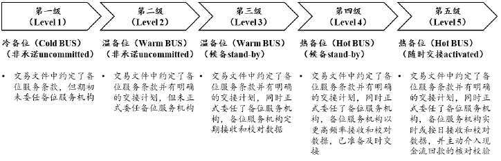 國際證券化市場參照信息科技學中的專業術語,根據服務商的接替工作準備到位程度(Readiness)的不同,把“備位服務”進一步區分為“熱備位(Hot BUS)、溫備位(Warm BUS)、冷備位(Cold BUS)”,具體含義如下:
