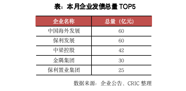 具體企業表現來看,5月發債量最大的企業是中海和保利發展,兩家企業的融資總量都是60億元,中海在本月發行了30億元的公司債以及30億元的中期票據,保利也發行了30億元的公司債和30億元的綠色中期票據。本月發行債券的企業有17家,發債企業個數環比減少5家。從發債年限來看,最長的是保利置業發行的一筆長達12年的ABS。從債券發行利率表現來看,金隅集團發行的一筆30億元超短融利率2.08%最低,另有保利發展、中海地產以及華潤置地發行了利率不超過3%的債券。