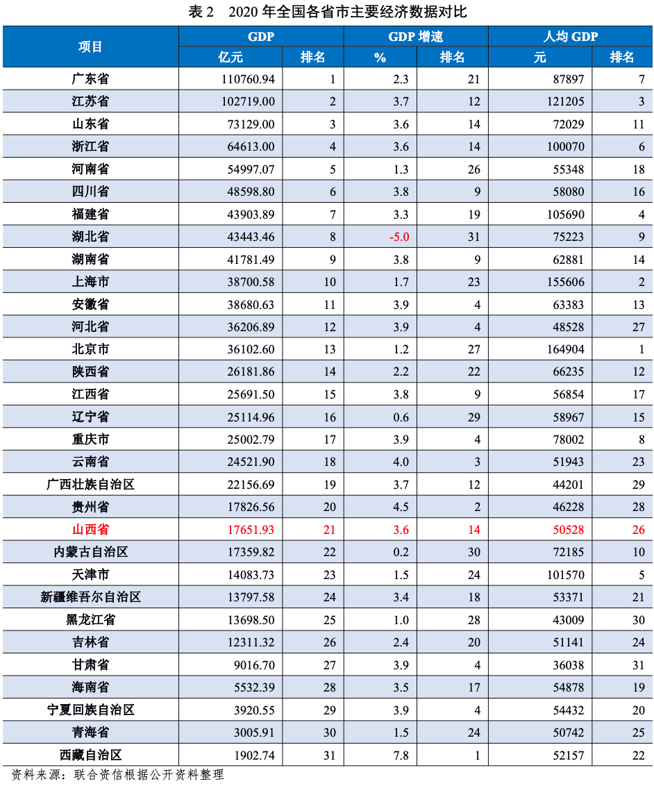 山西省自然資源稟賦良好,近年來經濟穩步發展,整體經濟發展水平處于全國下游,經濟總量及人均GDP在全國排名靠后。受新冠疫情影響,2020年山西省地區生產總值增速同比有所下降。2018-2020年,山西省第二產業占比波動上升,對煤炭產業依賴性強,在碳達峰和碳中和目標的背景下,山西省面臨較大的產業升級和結構調整壓力。2020年,山西省一般公共預算收入規模在全國排名第16位,稅收占比較高但財政自給程度一般,中央補助規模大且持續性好。2020年山西省政府負債率為26.13%,政府債務負擔較輕;山西省政府債務率為78.17%,償債能力較強。
