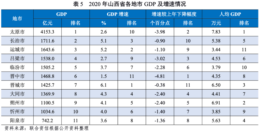 從經濟增速看,2020年山西省各地市經濟均保持增長態勢,但受新冠疫情影響,增速均有所下降,下降幅度排名前三名分別為晉中市、太原市和呂梁市;其中晉城市GDP增速位居省內第一位,GDP增速下降幅度最小。太原市、呂梁市和晉中市增速低于全省平均水平(3.6%),其他地市GDP增速均超過全省平均水平。