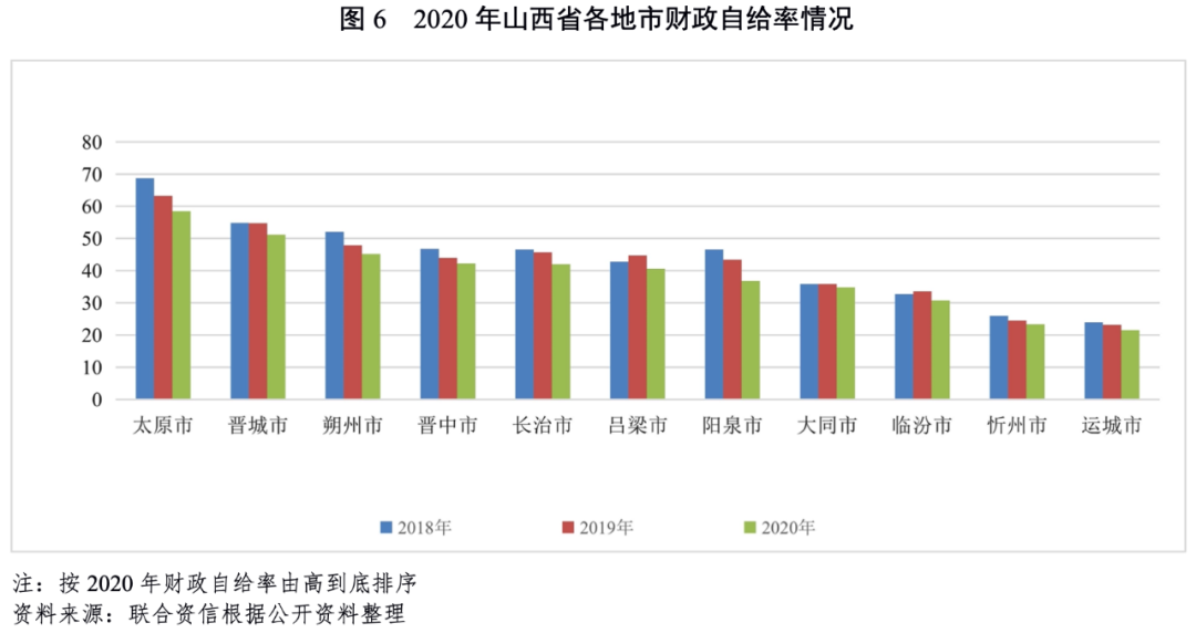 山西省各地市財政實力差異較大,其中太原市財政實力遠超其他地市,一般公共預算收入穩定性較強;近年來山西省各地市財政自給率呈不同程度的下降,多數地市財政自給能力較弱。山西省各地市政府債務余額呈快速上升趨勢,晉城市增長最快。2020年,山西省各地市負債率均較上年有所上升,但各地市債務負擔仍較輕;山西省內陽泉市償債能力排名靠后,各地市整體償債壓力不大。