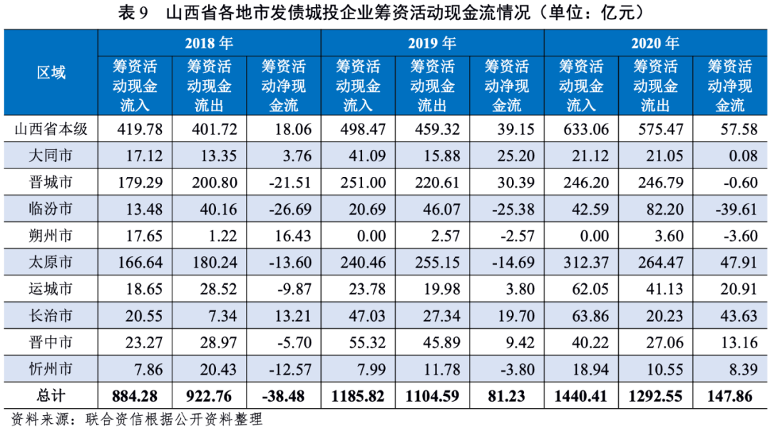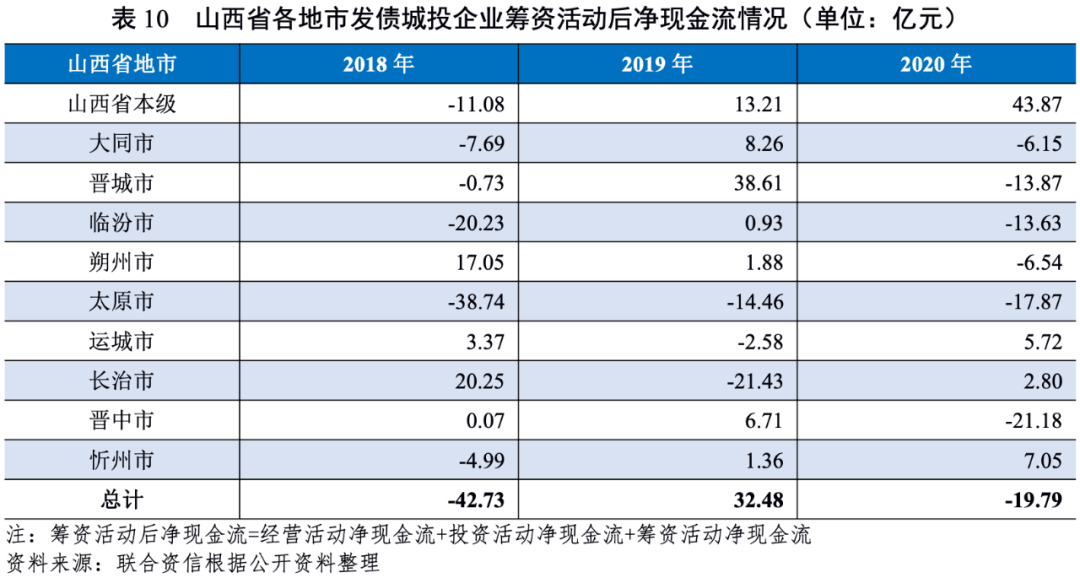 從籌資活動現金流狀況來看,2018-2020年,山西省城投企業籌資活動現金轉為凈流入且流入規模有所擴大。由于臨汾市城投企業業務回款和收到的往來款較多,債務償還多依賴經營性現金流,2018-2020年,臨汾市城投企業籌資活動現金持續凈流出。2020年,山西省發債城投企業籌資活動現金流較2019年普遍改善,主要由于融資環境相對寬松。除臨汾市、朔州市和晉城市外,山西省2020年發債城投企業籌資活動現金流均呈凈流入狀態。