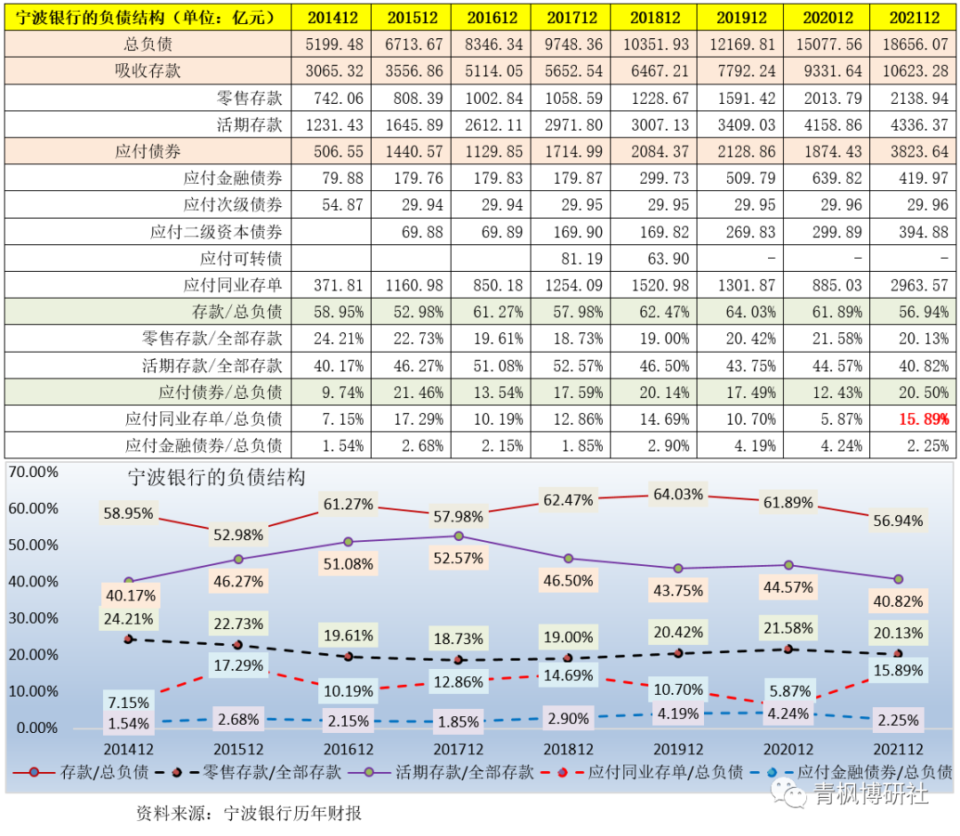 存款在商業銀行的負債中具有重要地位。截至2021年底,寧波銀行的存款占其總負債的比重為57%,較2020年下降4.95個百分點。不過,寧波銀行的零售存款僅占其全部存款的20%左右、活期存款占其全部存款的比例亦降至40%附近,較2020年分別亦下降1.43個百分點和3.75個百分點。