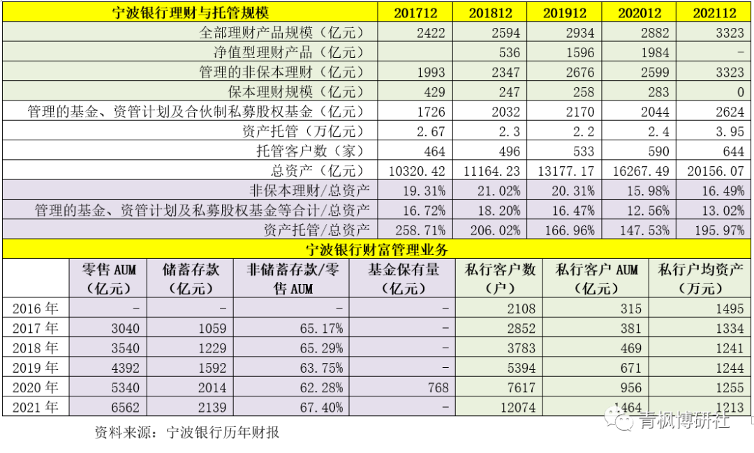 2、截至2021年底,寧波銀行零售AUM達到6562億元(較年初增加1222億元)、私行客戶AUM達到1464億元(較年初增加508億元)、私行客戶數達12074戶(戶均資產達1212萬元)。其中,在寧波銀行零售AUM的構成中,非儲蓄存款占比高達67.40%。