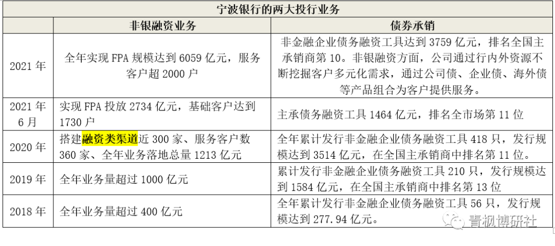 2021年,寧波銀行投行業務實現FPA投放6059億元(債券承銷3759億元)。寧波銀行的投行業務致力于為客戶提供投資、融資及顧問等綜合金融服務,具體包括債券承銷、ABS和非銀融資三類。剔除掉3759億元的債券承銷后,意味著ABS和非銀融資規模合計約為2300億元。但是,寧波銀行的非銀融資業務具體內涵是什么基本上算是黑匣子,其并沒有給出具體的信息披露。